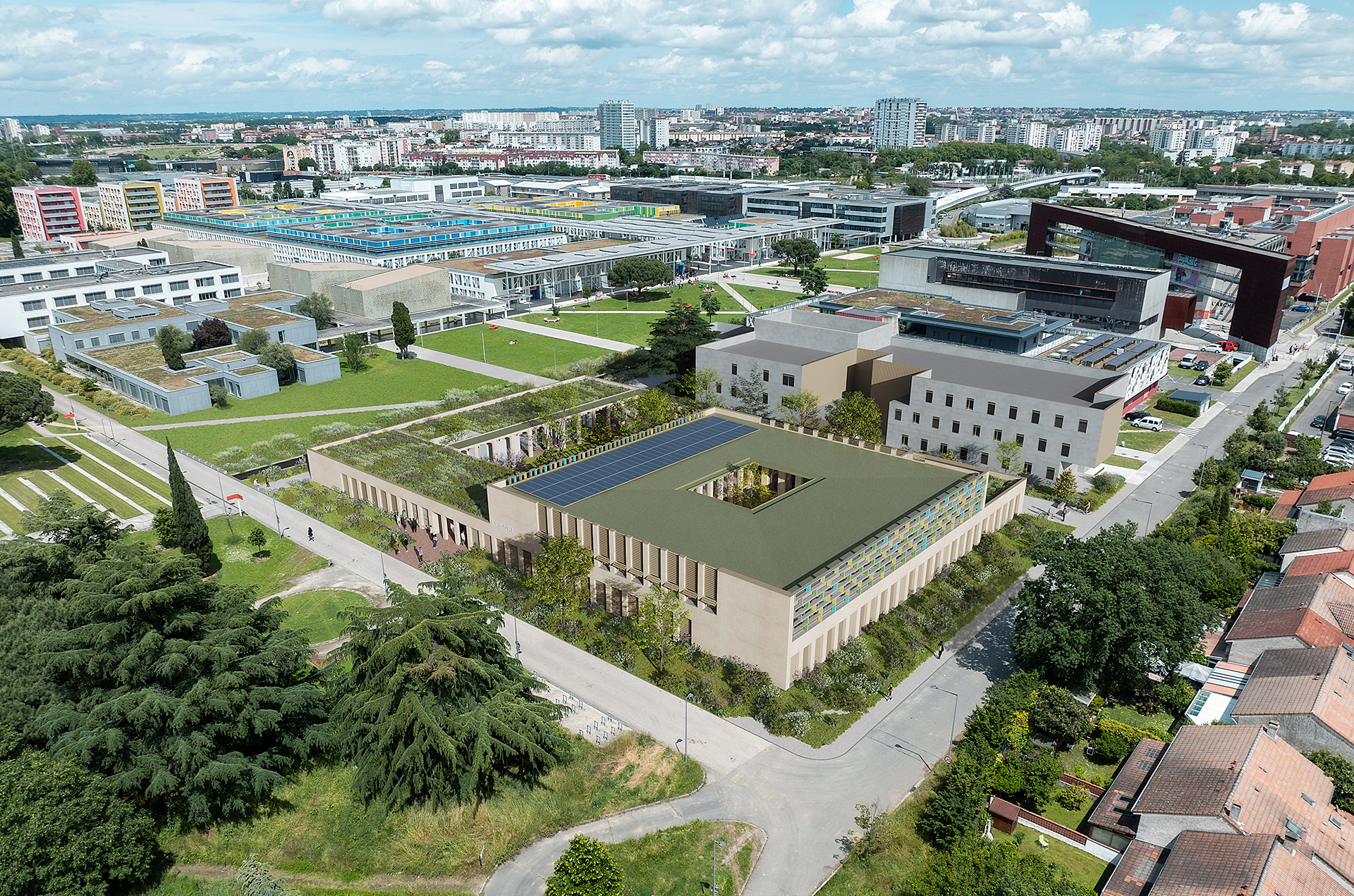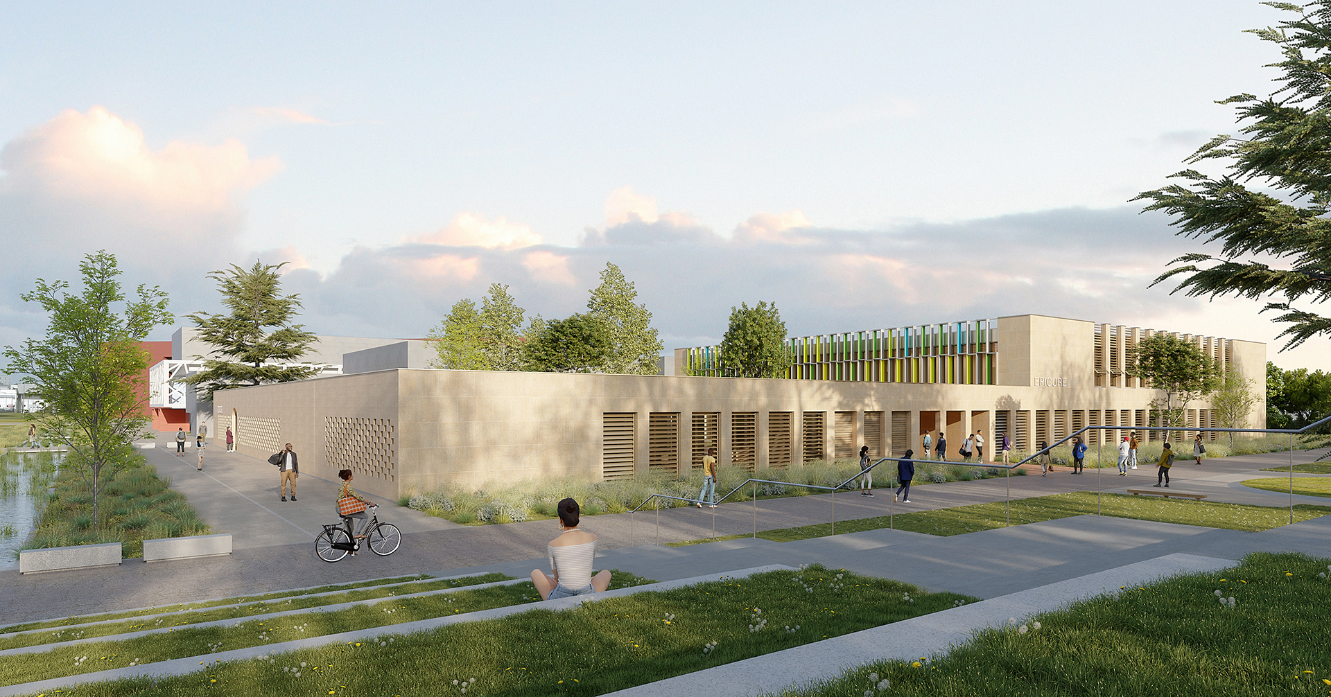 La construction du bâtiment Épicure est l’occasion de réinterpréter les grands principes d’aménagement du campus du Mirail, pensés par Candilis, Josic et Woods : cheminements conçus comme artères de vie, dissociation des flux, maillage de réseaux en sous-sol, organisation autour de patio et trame orthogonale. Afin de conserver une cohérence urbaine, le projet vient créer un trait d’union avec le plan d’ensemble, pour obtenir un carré parfait basé sur la trame originelle de 6x6 m.