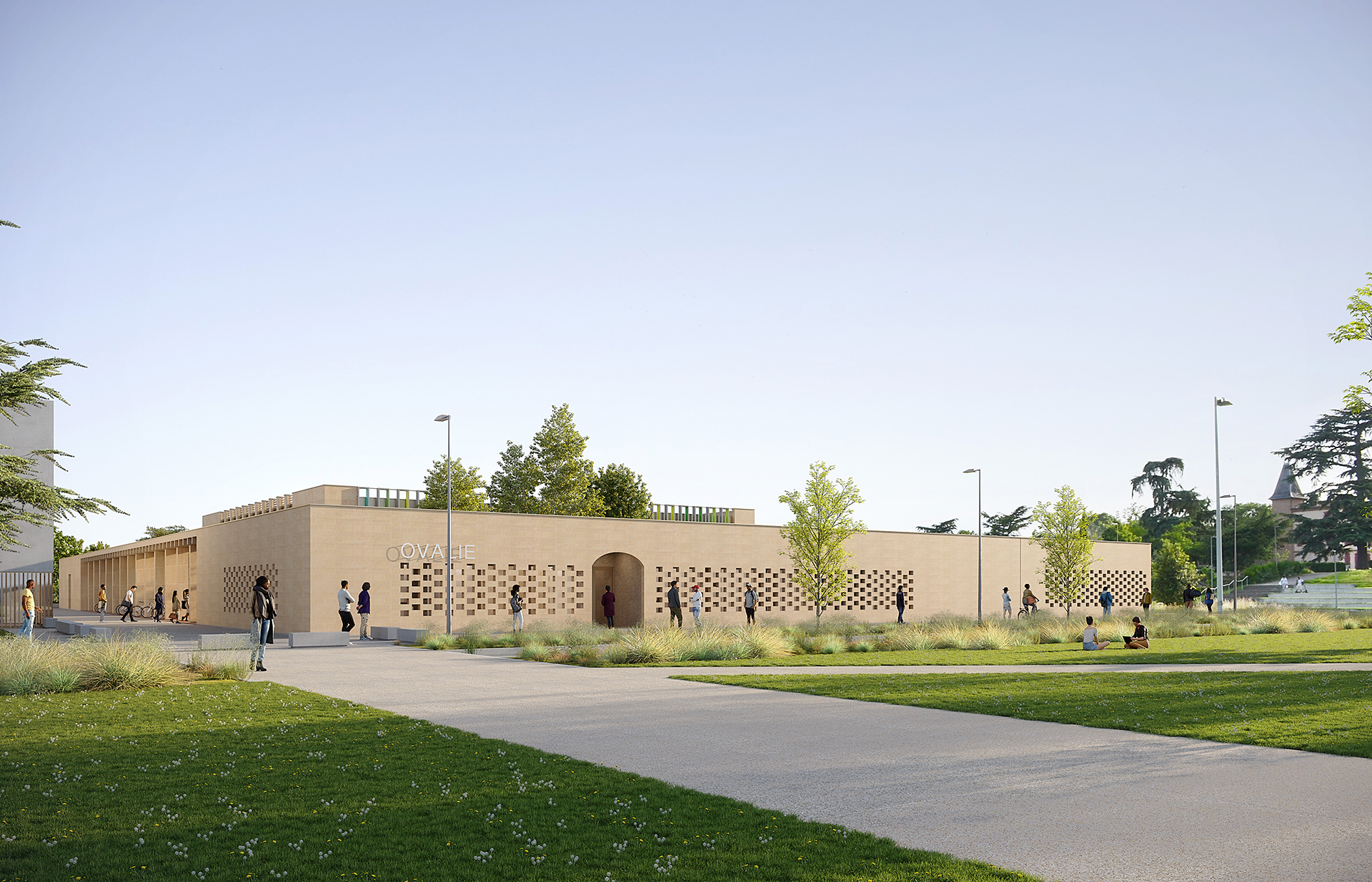 Dans l’alignement des existants, un premier bâtiment dédié à la vie étudiante vient prolonger le bâtiment Ovalie, rénové dans le cadre du projet, à l’angle Nord-Ouest de la parcelle. Conçu en simple RDC et accessible depuis le hall, ce volume bas permet de libérer depuis l’Université ouverte une percée visuelle vers le Parc du Château. Tandis que le bâtiment Épicure, second volume conçu en R+1, s’articule autour du petit patio central végétalisé, éclairant naturellement les circulations.