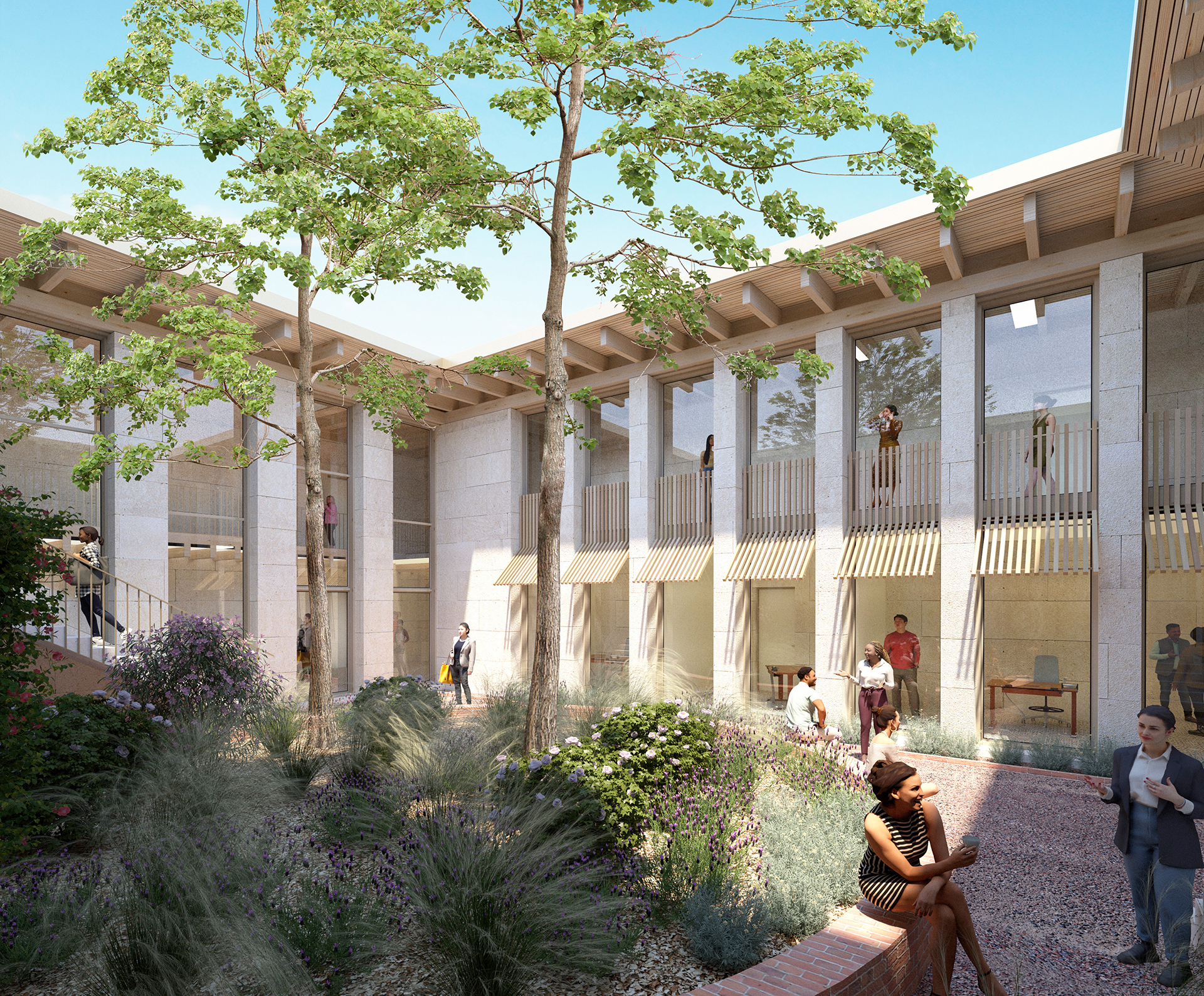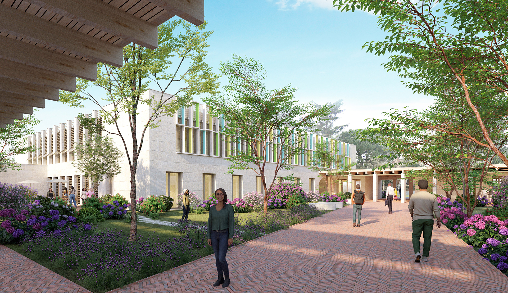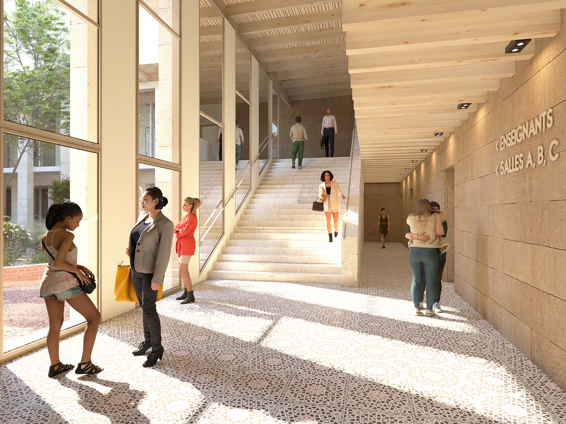Les nouveaux volumes s’implantent dans l’alignement des constructions existantes et reconstituent un grand patio au cœur du projet, véritable lieu de vie et îlot de fraîcheur, protégé des vents dominants. Les volumes homogènes s'organisent autour d’un généreux jardin, favorisant les espaces en pleine terre. Un large cheminement pavé vient marquer la diagonale d’Est en Ouest, reliant ainsi l’Université ouverte avec le parvis Ouest.