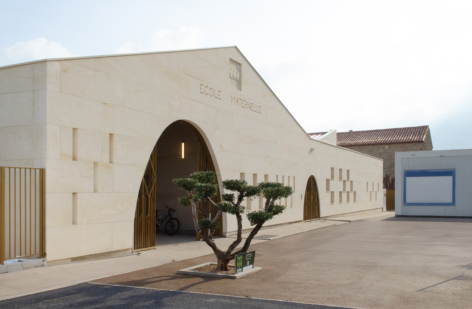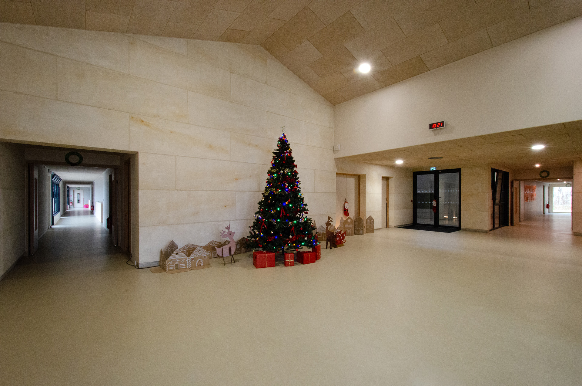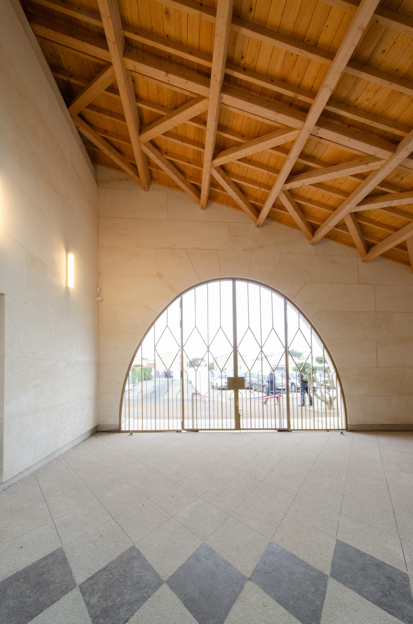 À Saint Nazaire d’Aude, la pierre est omniprésente, elle semble respirer, nous parler, véritable témoignage de notre patrimoine et de notre richesse architecturale locale. En réponse à cela, une grande voûte en pierre massive marque un signal fort depuis l’entrée. Le sol est recouvert d’un pavage en forme de losanges, reprenant le dessin du blason de la ville, clin d’œil à son histoire et support pédagogique pour les enfants.