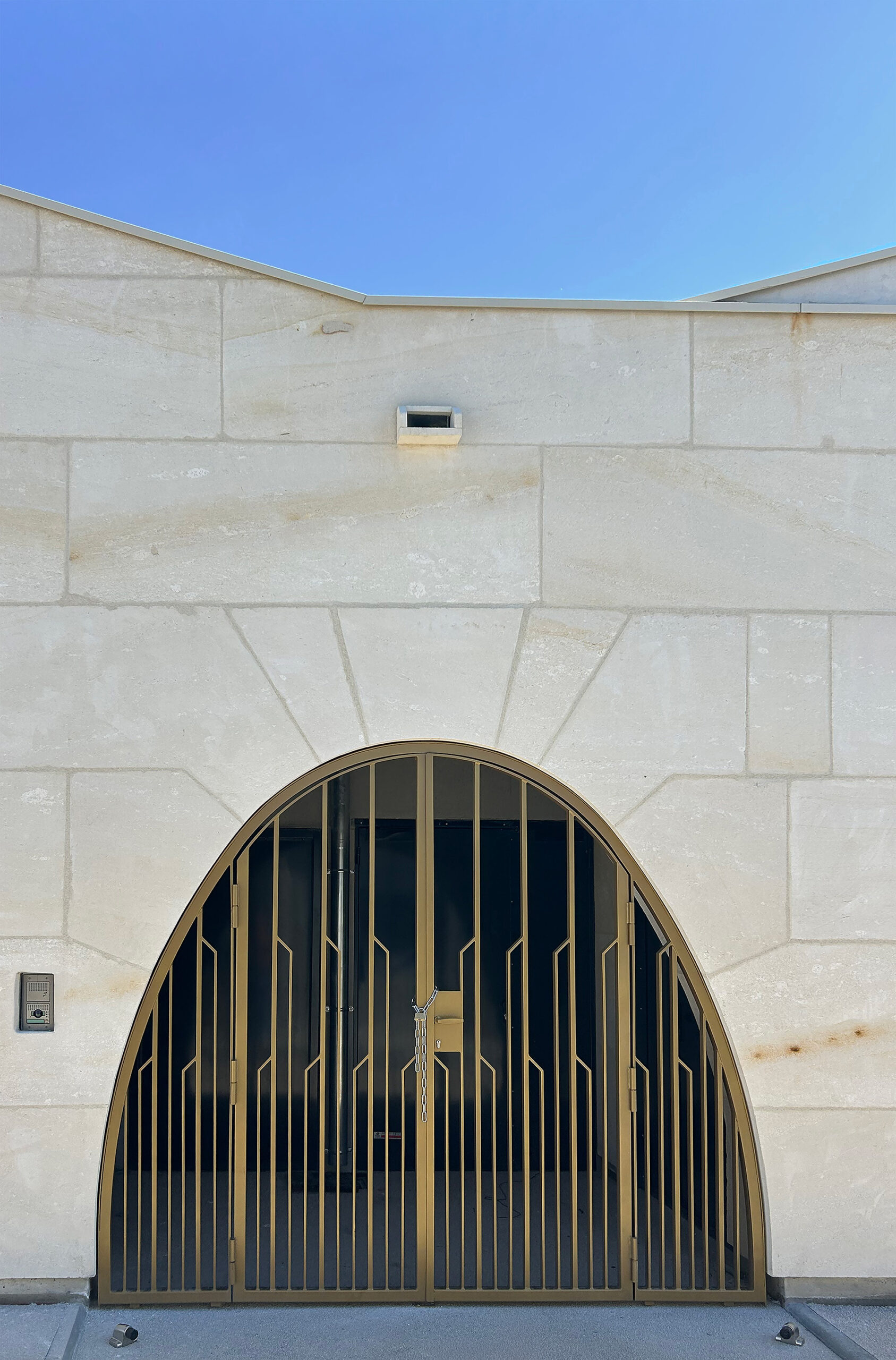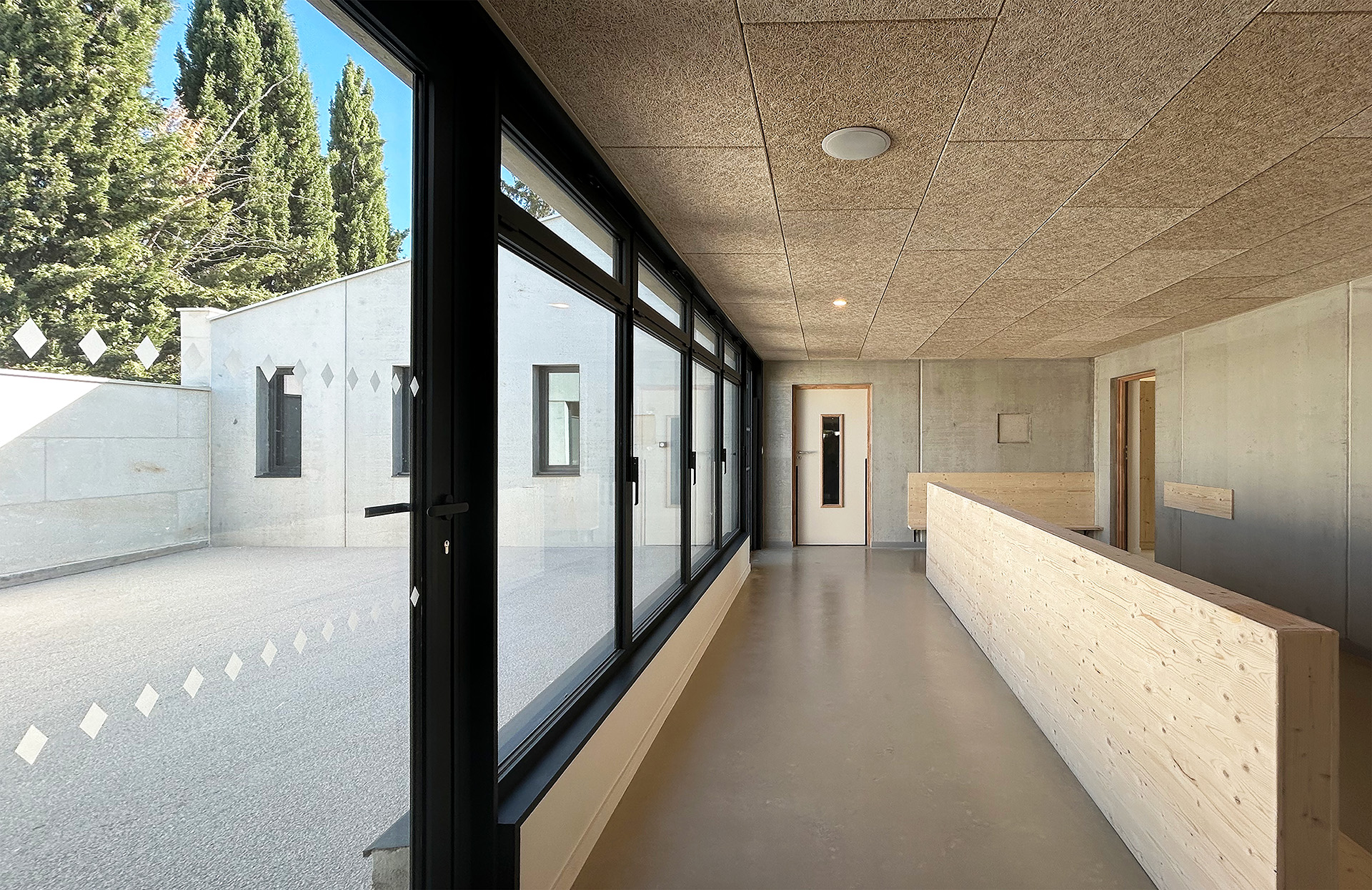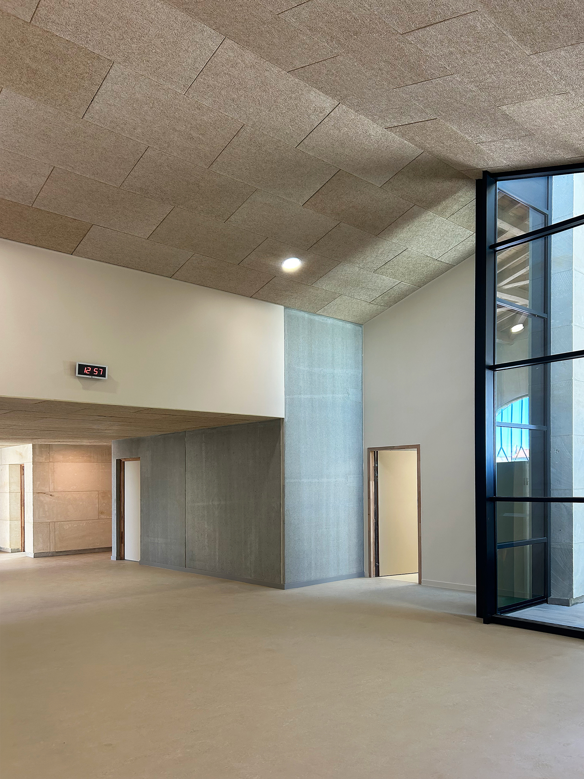 À Saint Nazaire d’Aude, la pierre est omniprésente, elle semble respirer, nous parler, véritable témoignage de notre patrimoine et de notre richesse architecturale locale. En réponse à cela, une grande voûte en pierre massive marque un signal fort depuis l’entrée. Le sol est recouvert d’un pavage en forme de losanges, reprenant le dessin du blason de la ville, clin d’œil à son histoire et support pédagogique pour les enfants.