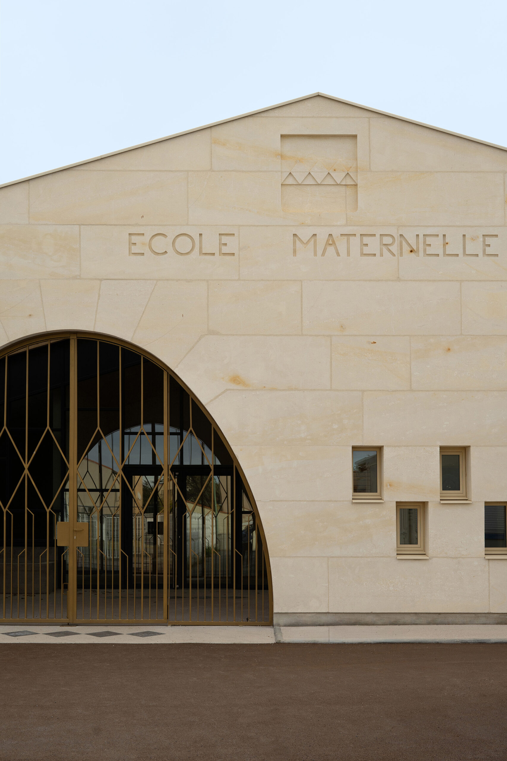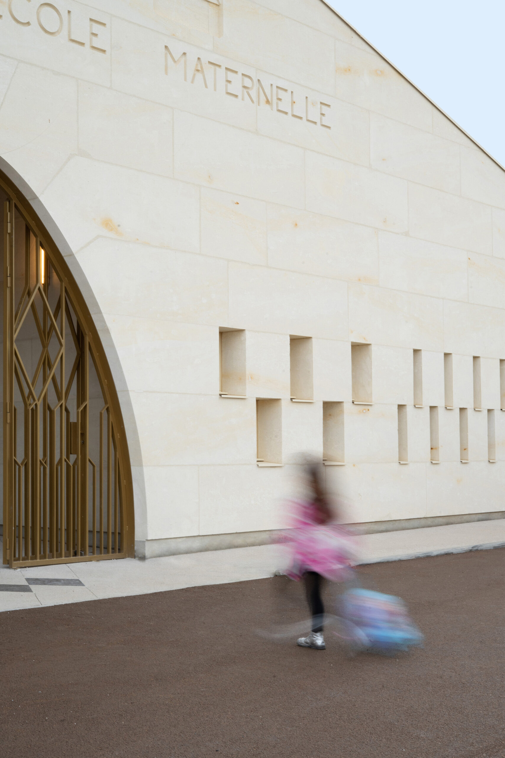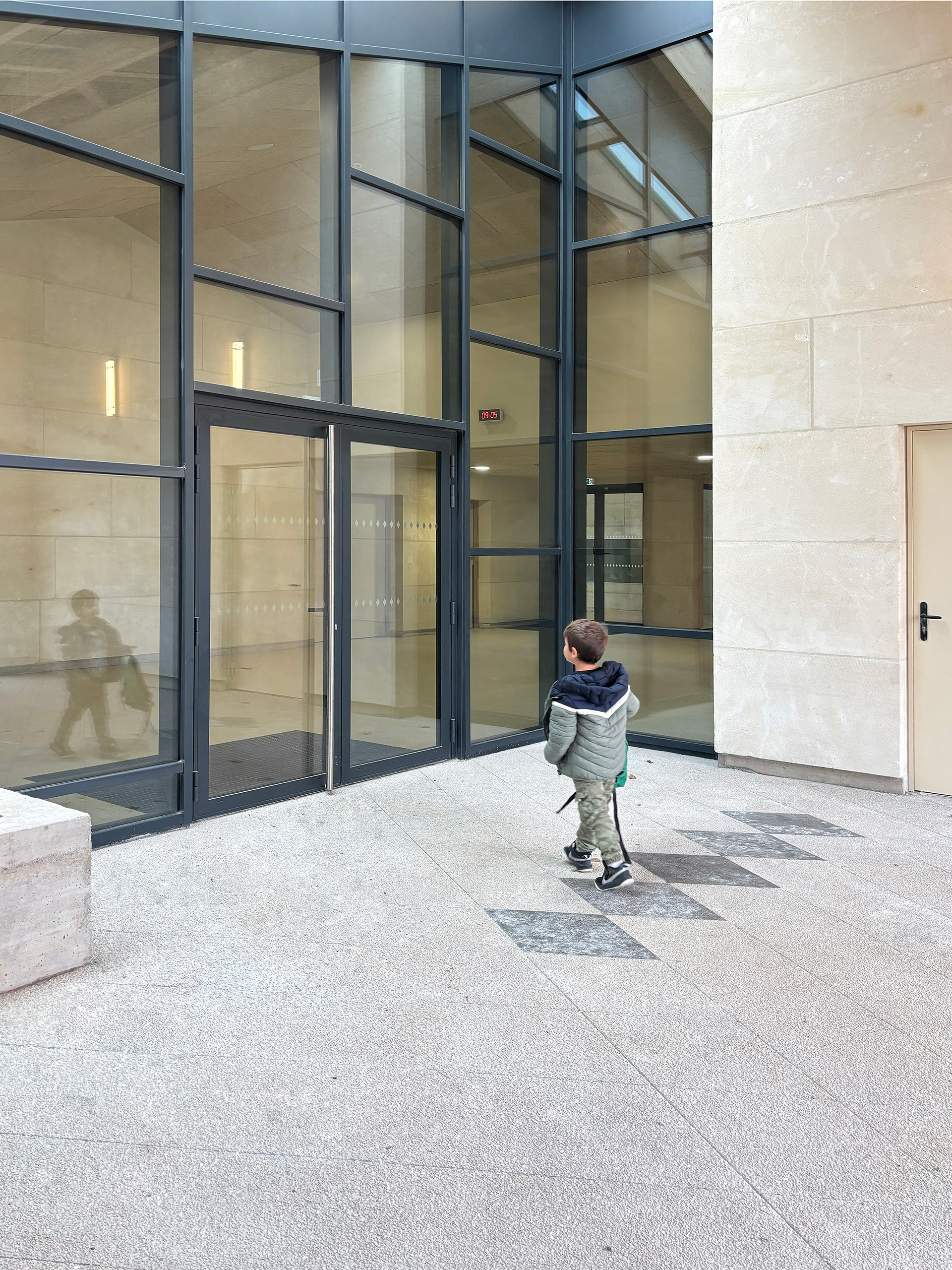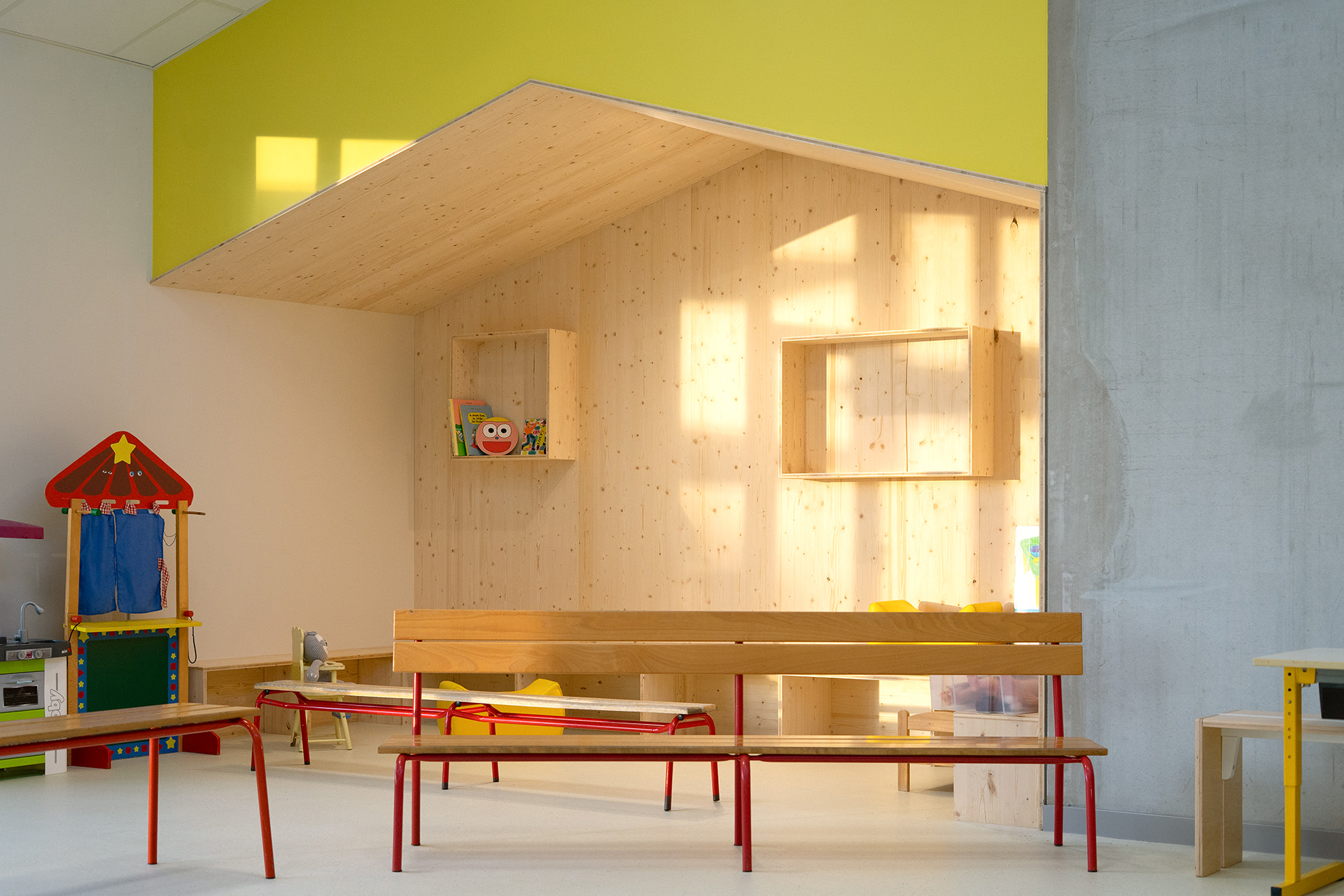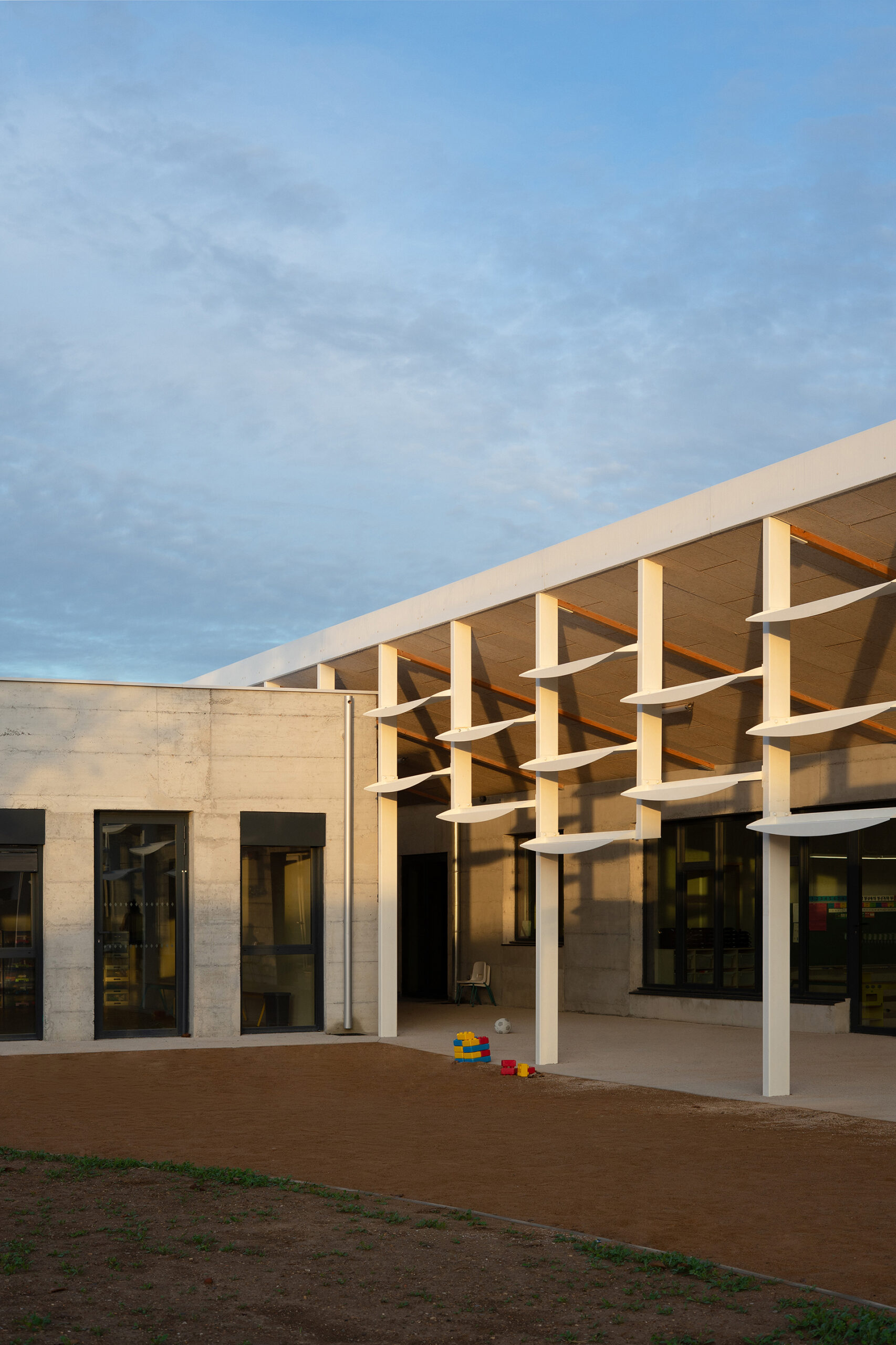 Le bâtiment, en forme de L, vient s’étirer le long des limites de propriété Nord et Ouest, naturellement, il crée un front urbain face à l’école maternelle existante. L’implantation du projet protège la grande cour des vents dominants, et propose une cour conçue à l’image d’un Oasis. Largement végétalisé en son centre, ce lieu protégé, à l’échelle de l’enfant, est à l’abri des regards et de la rumeur urbaine.