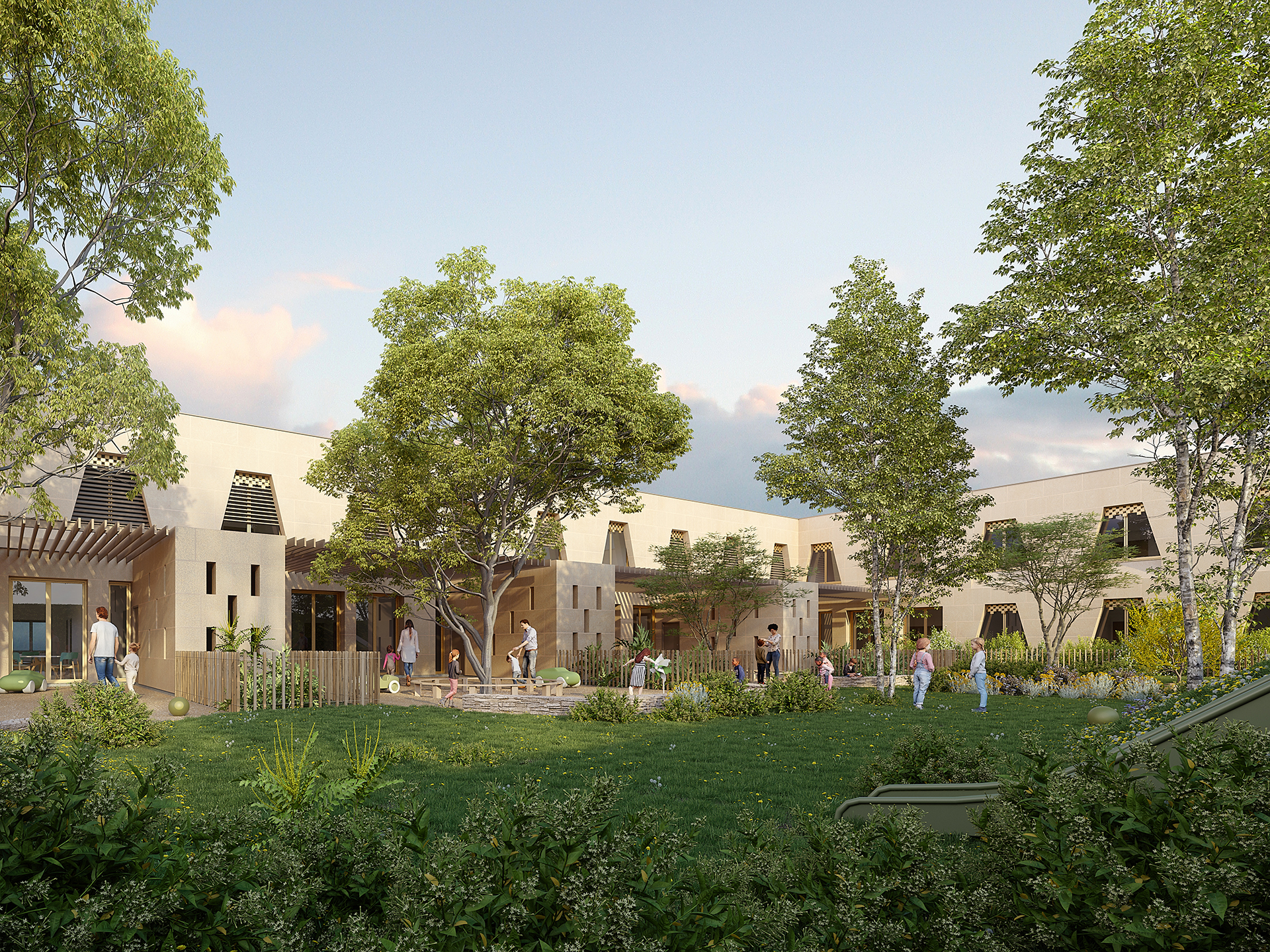 Construction neuve d’un ehpad de 80 lits et crèche de 62 berceaux, locaux communs et espaces extérieurs.