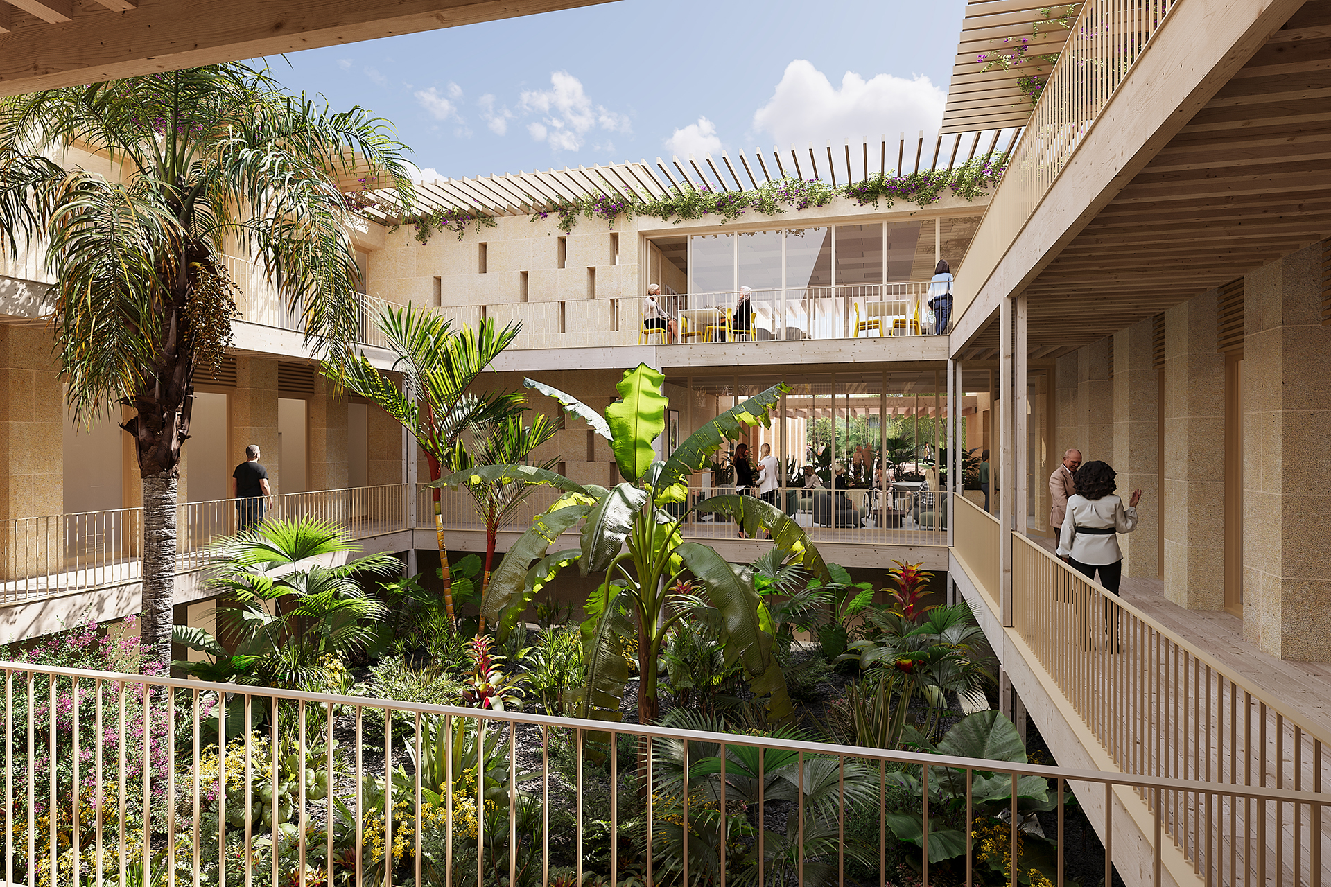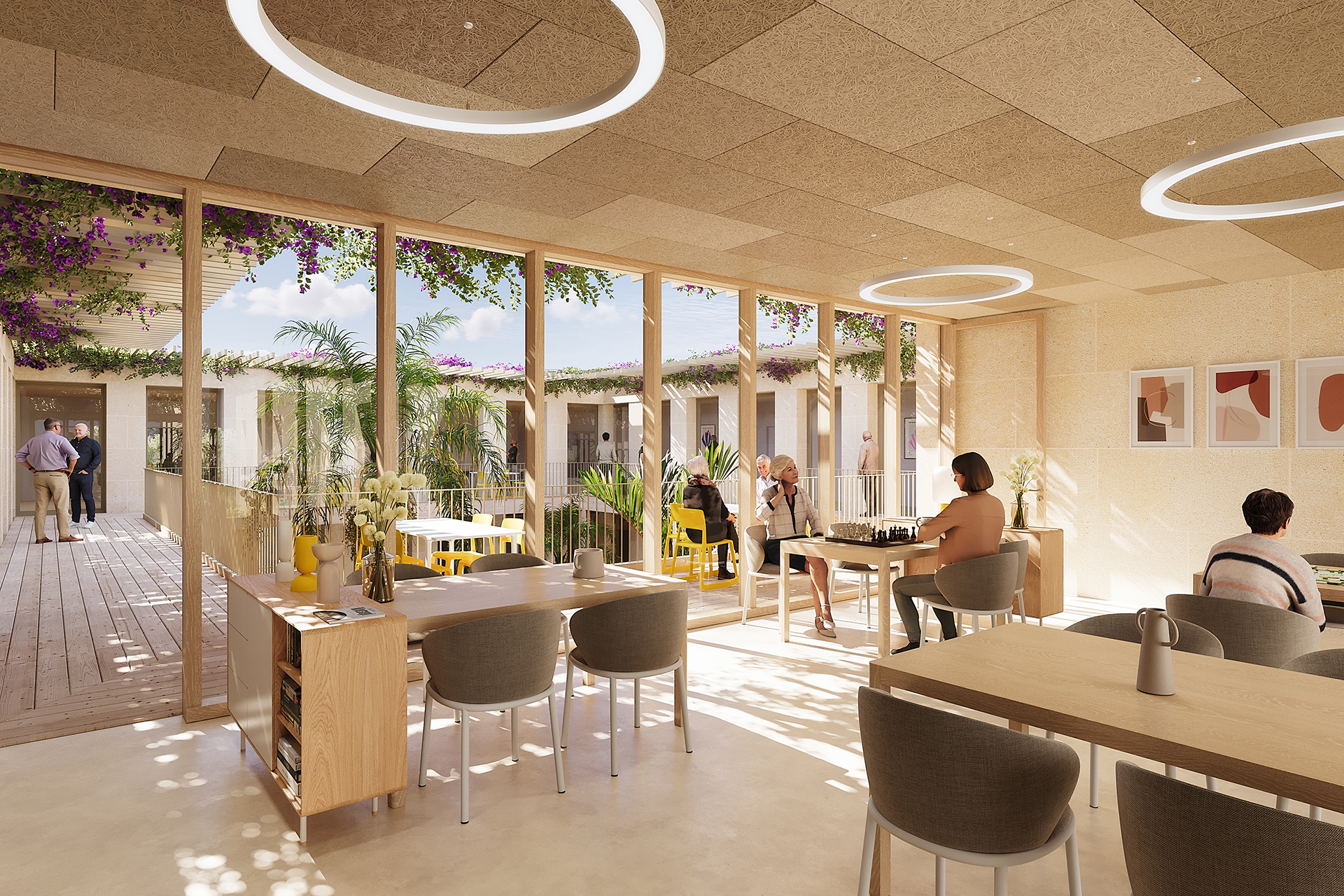 Enfin, nous savons qu’habiter et être sont étroitement liés, c’est pourquoi nous appréhendons l’EHPAD comme un véritable lieu de vie, en invitant les résidents à s’approprier le bâtiment. Il s’agit de préserver la liberté de mouvement pour favoriser l’autonomie, en offrant des espaces agréables, facilement accessibles et sécurisés pour tous. L’aménagement paysager propose de nombreuses activités en plein air : jardin des sens, séances de relaxation, contemplation, activités physiques, jeux... L’objectif est de créer un environnement propice à la satisfaction et au bien-être, où les résidents, stimulés et heureux, conservent leur dignité.