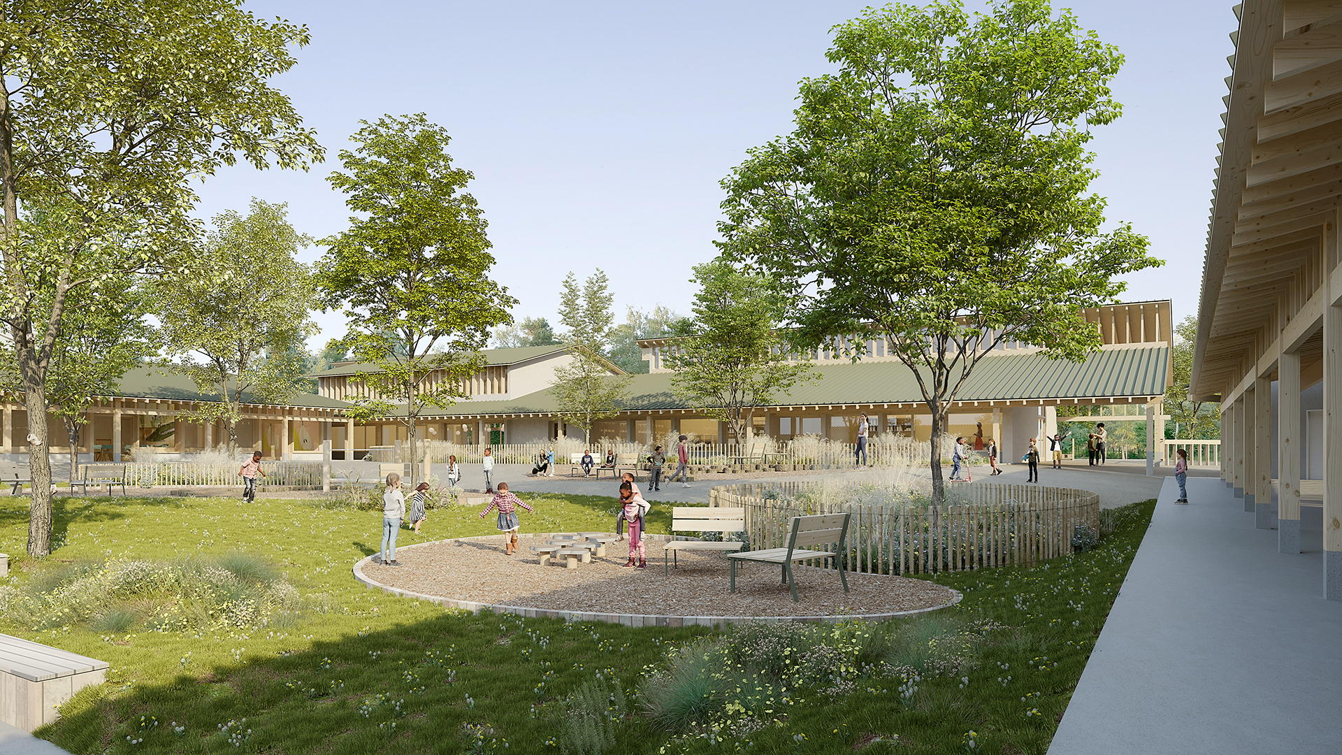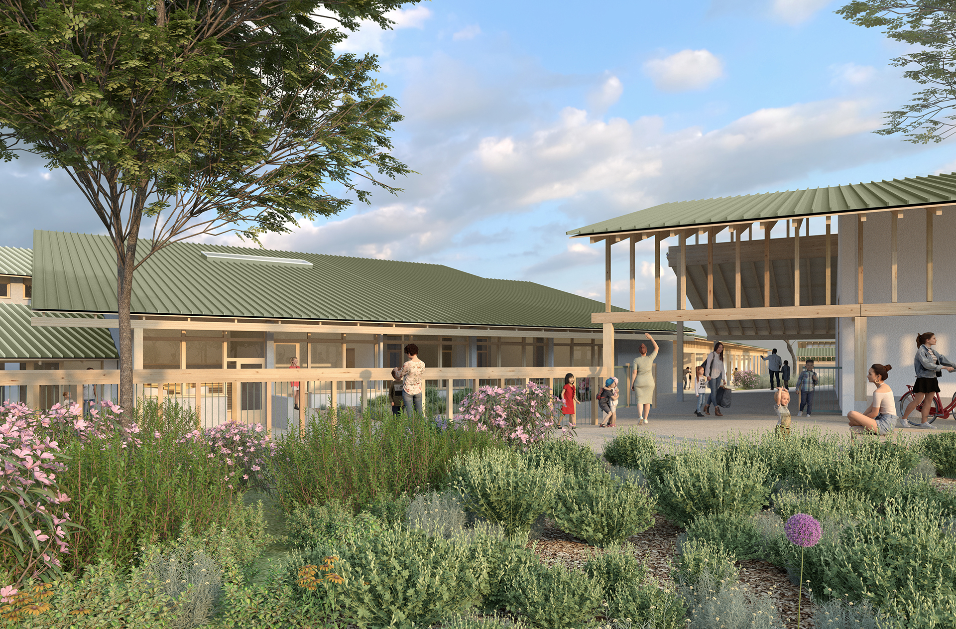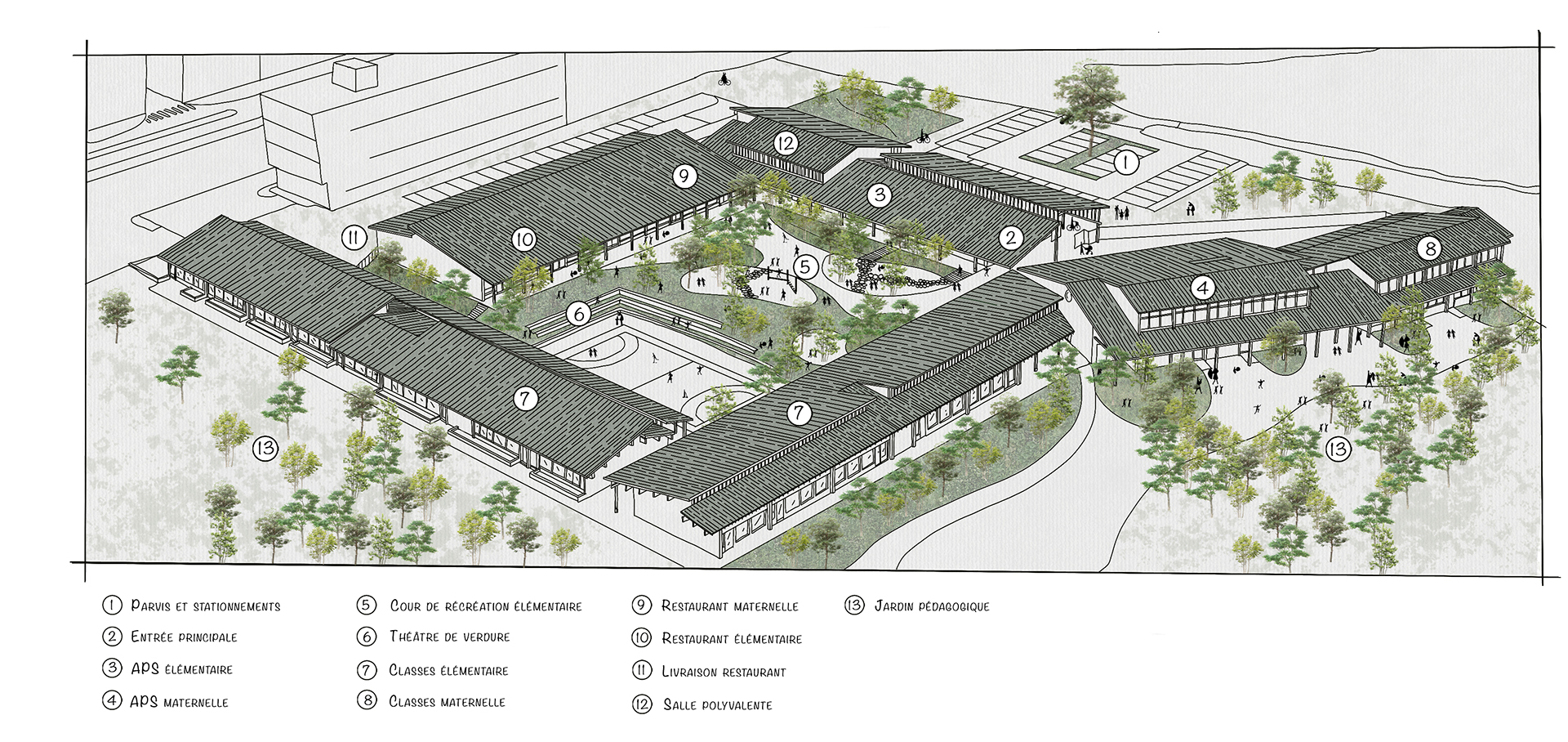 La volumétrie des bâtiments neufs s'inspire des existants réhabilités, les grands toits en pente marquent le paysage. Positionnés de manière à se frôler sans se toucher, les débords des toitures deviennent coursives, sans éléments rapportés. A la manière d'un cloître, elles garantissent un continuum spatial couvert. La mise en œuvre d'une double-peau sur les linéaires des façades principales permet une protection solaire efficace et offre des cheminements protégés en pied de façade, ce dispositif donne une homogénéité volumétrique, marquant le renouveau du groupe scolaire.