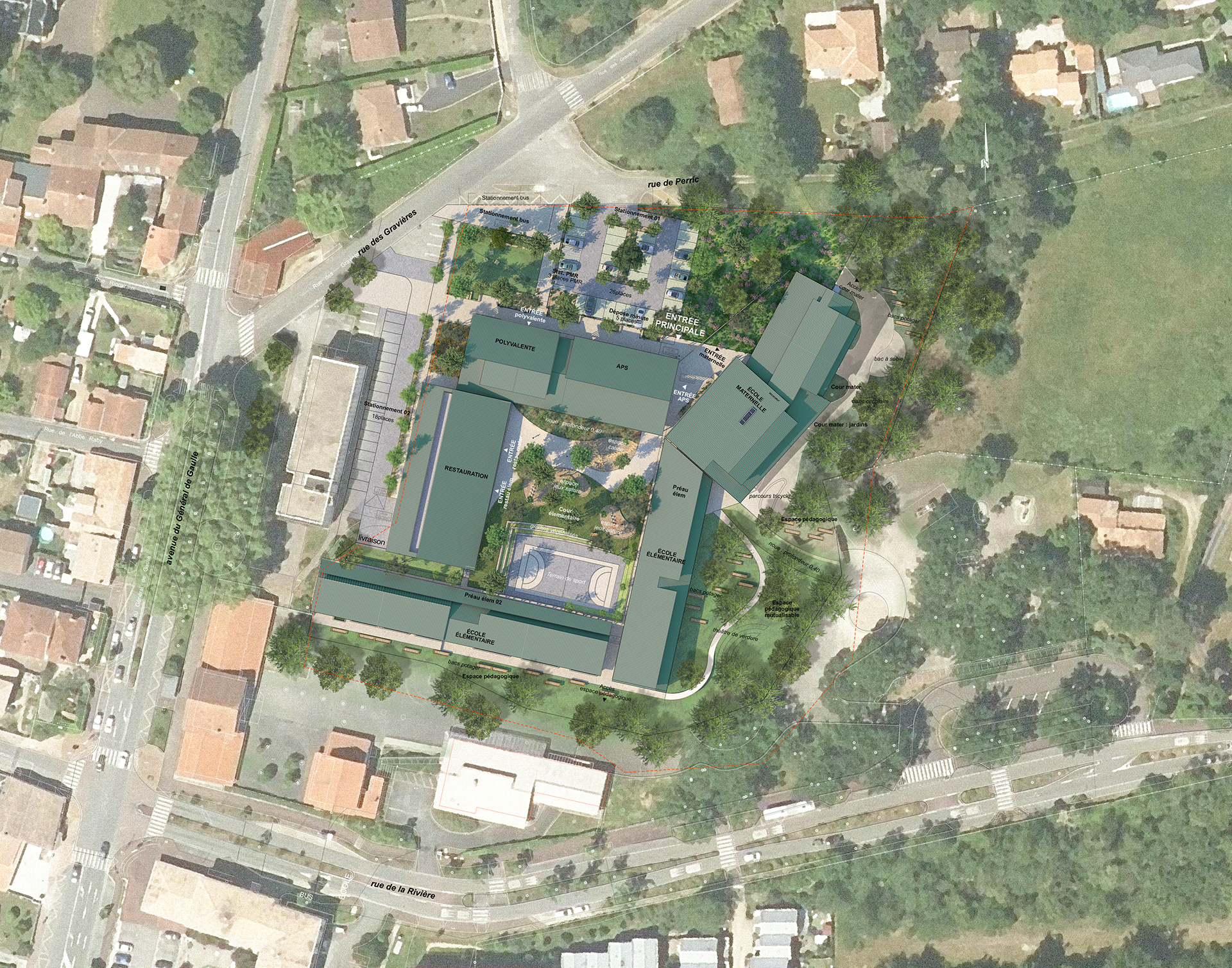 Réhabilitation et construction neuve : école maternelle (6 classes), école élémentaire (11 classes), dortoirs, locaux communs et administratifs, salle polyvalente, restauration, salle de motricité, espaces extérieurs, parvis, stationnements.
