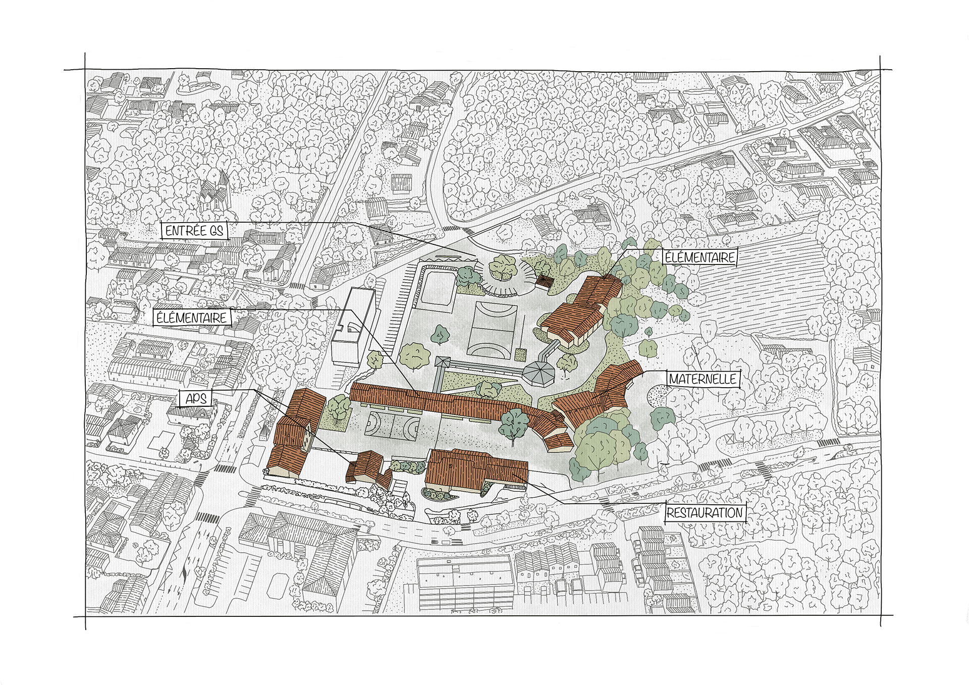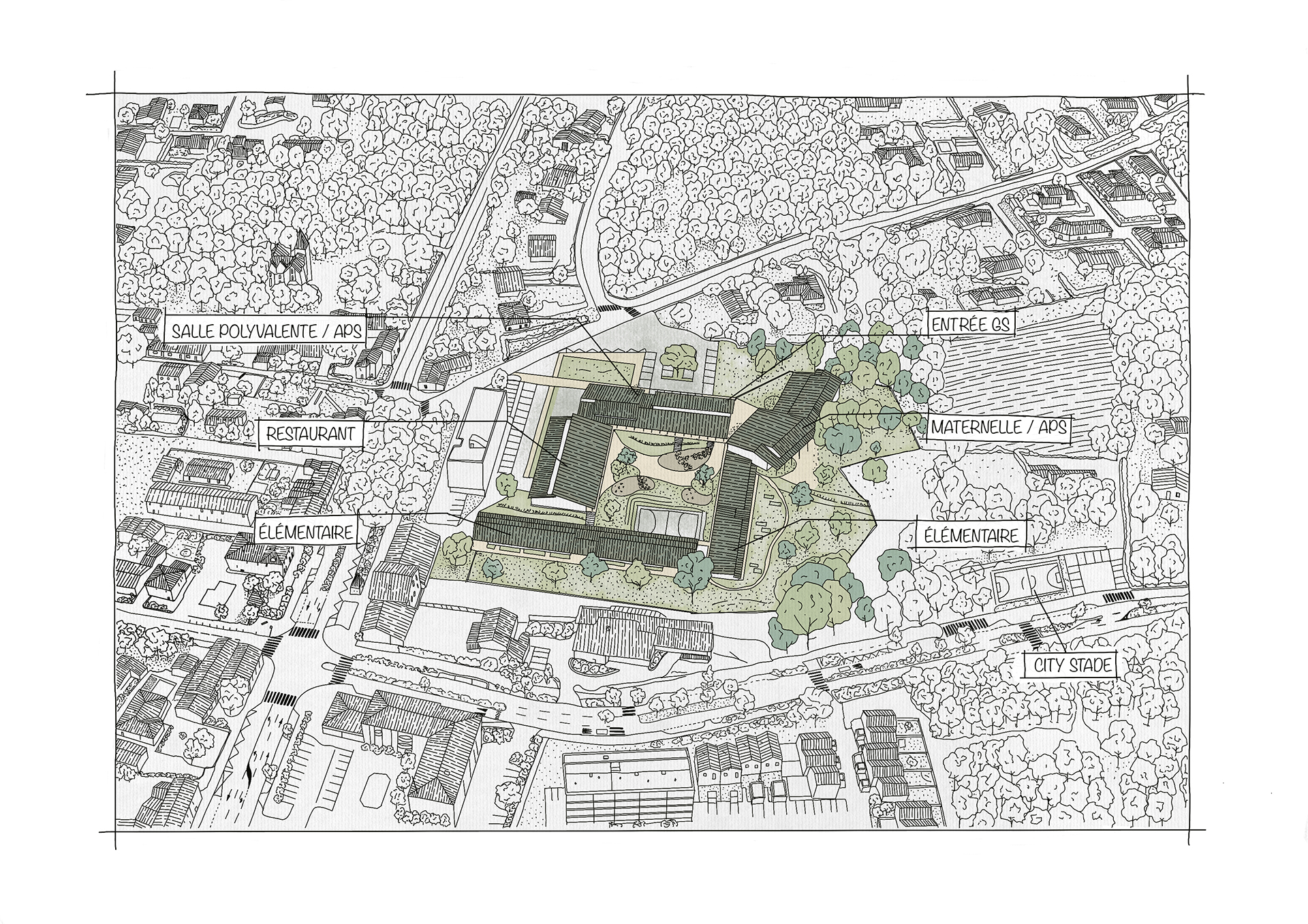 Pour cela, nous avons réorganisé les fonctions afin de retrouver une centralité, améliorer le fonctionnement et sécuriser le flux des élèves. Ainsi, nos choix d'implantation ont le double avantages de structurer les espaces, neufs et réhabilités, en convergeant vers une grande cour centrale redimensionnée, et de renforcer la présence du végétal. Les fonctions ainsi regroupées, les espaces arrière libérés sont redéfinis pour permettre l’émergence d’un parcours paysager périphérique, propice à un enseignement encadré en extérieur.