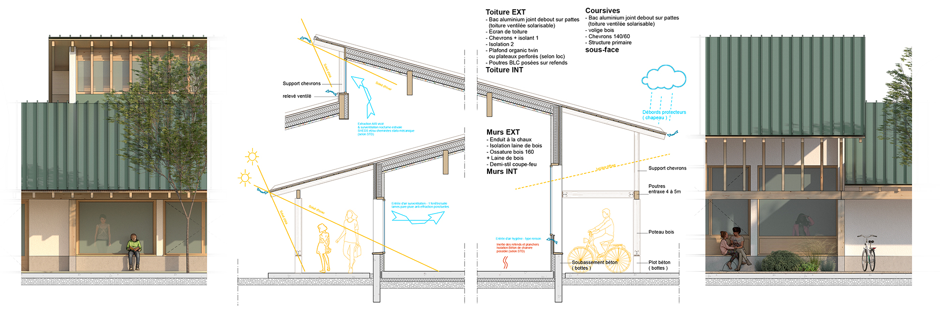 Nos choix constructifs restent frugal et minimisent l'emploi du béton, avec la mise en œuvre de charpente bois, mur à ossature bois, béton de chanvre renforçant l'inertie. Ils privilégient également le confort d'usage par de grandes hauteurs sous plafonds permettant l'installation de sheds, des espaces traversants favorisant la surventilation nocturne pour le meilleur confort d'été. En intérieur, l'usage massif de matériaux biosourcés procure une ambiance chaleureuse et apaisante.