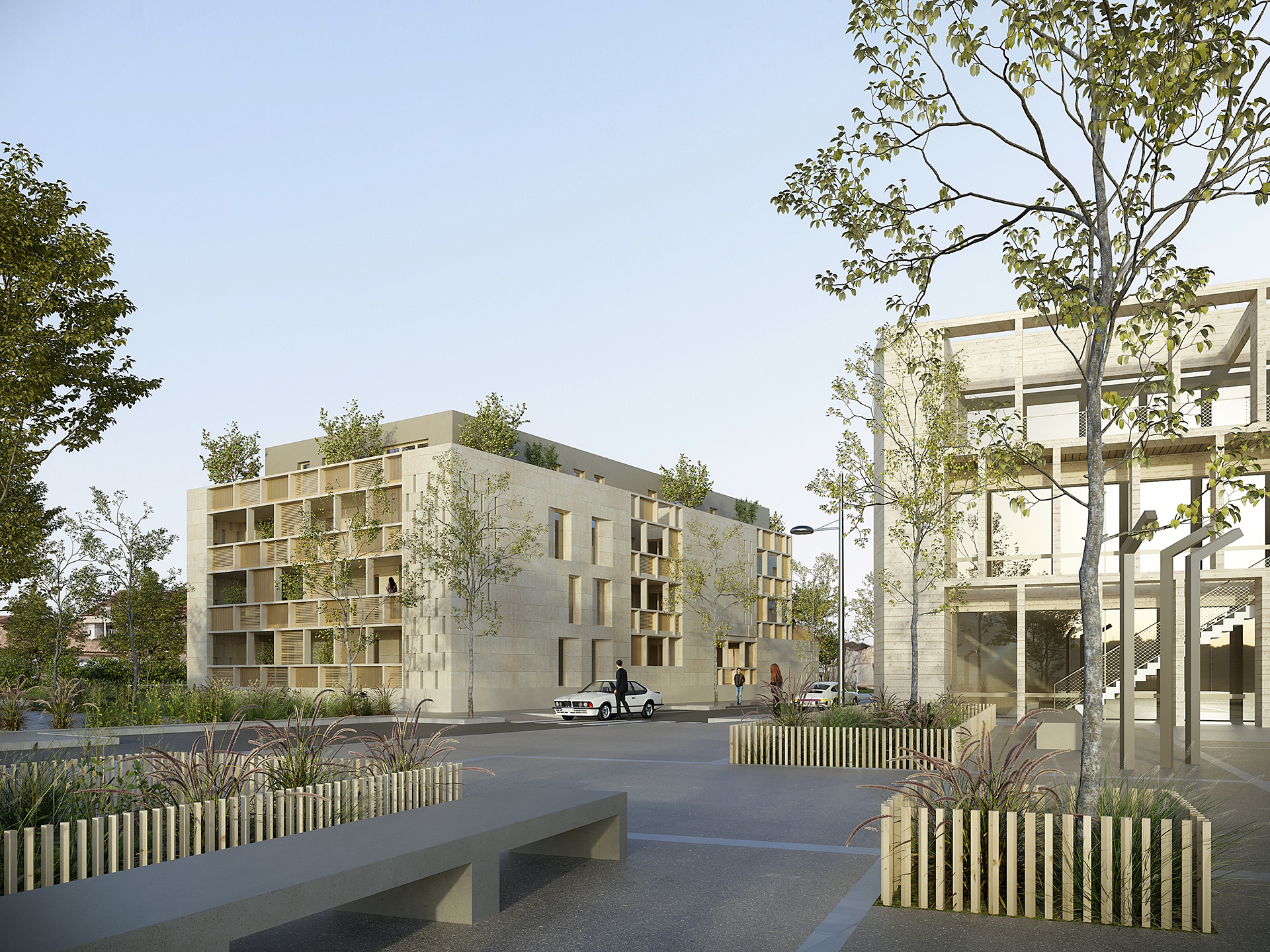 Conçu comme un îlot de fraîcheur, le cœur d’îlot est largement planté et accueille un point d’eau pour entretenir un micro-climat. Son implantation est réfléchie afin de favoriser la circulation de l’air. Enfin, il est également lieu de transition entre l’espace public et l’espace privé par le biais d’un parcours piéton sécurisé.